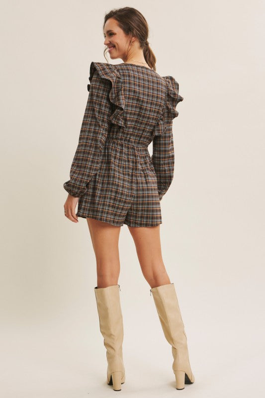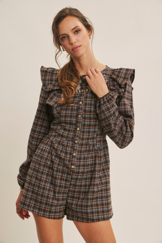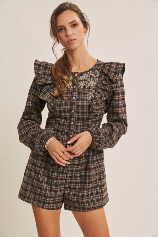 WESTERN RUSTIC TEXTURE EMBROIDERY PLAID RUFFLE ROMPER