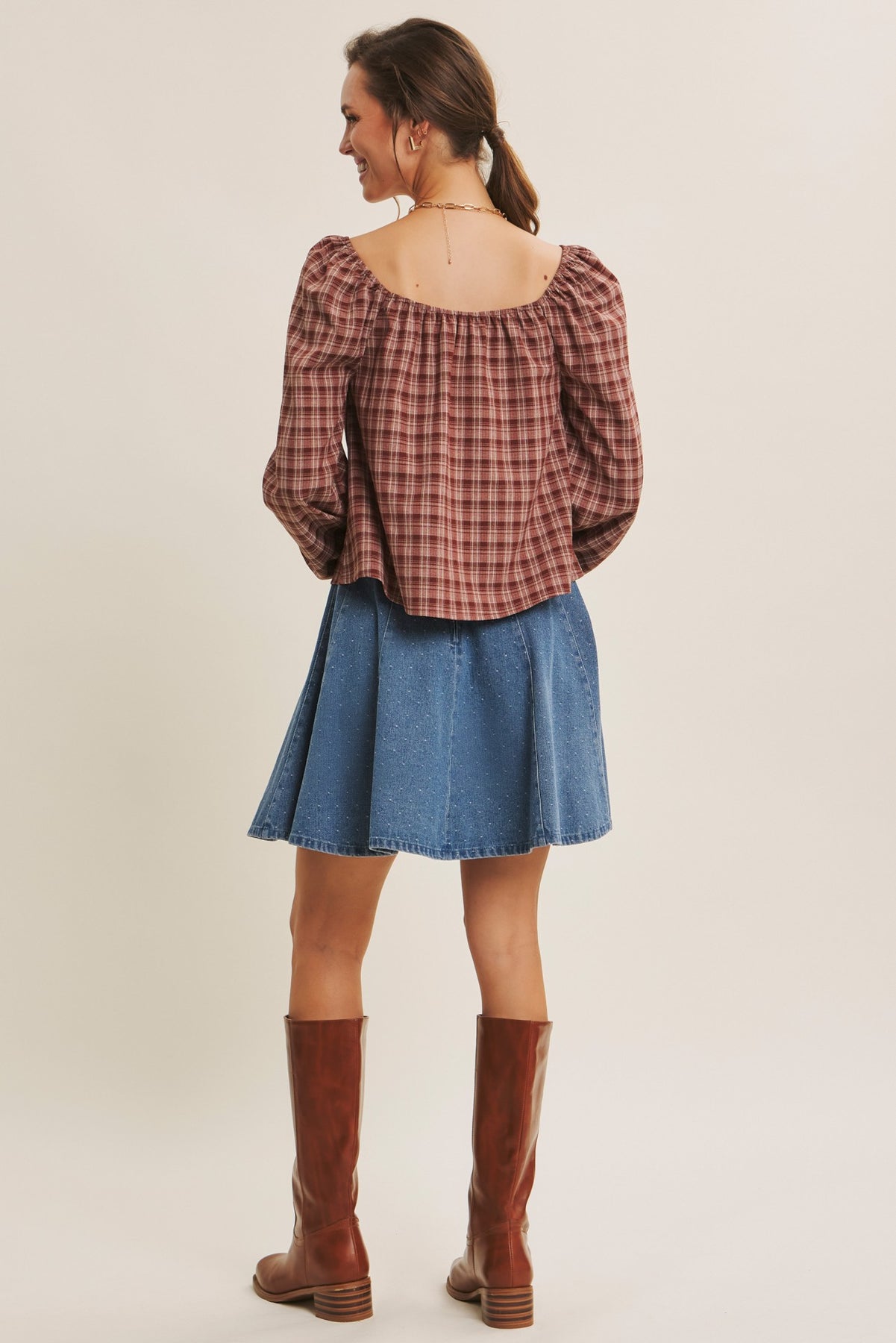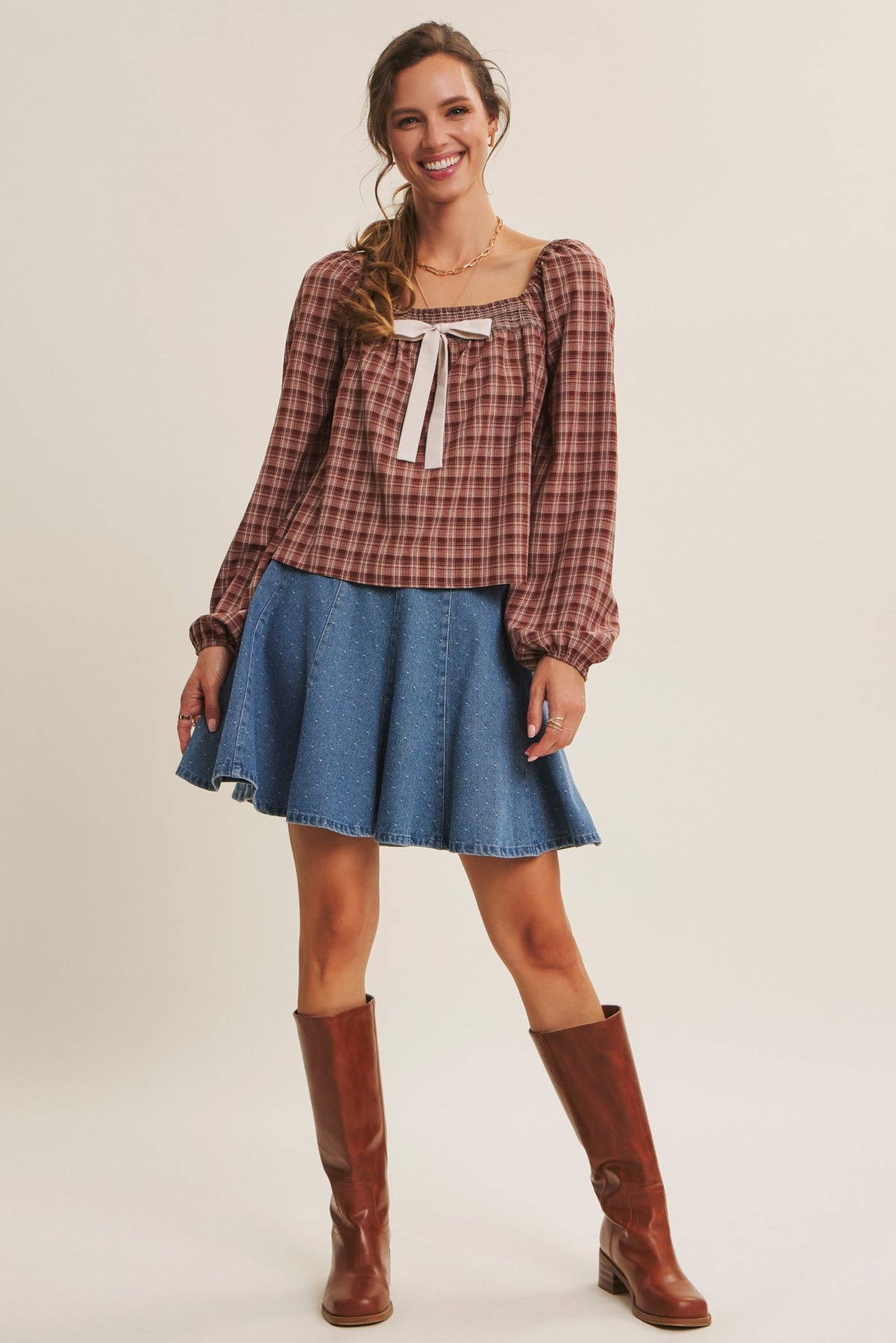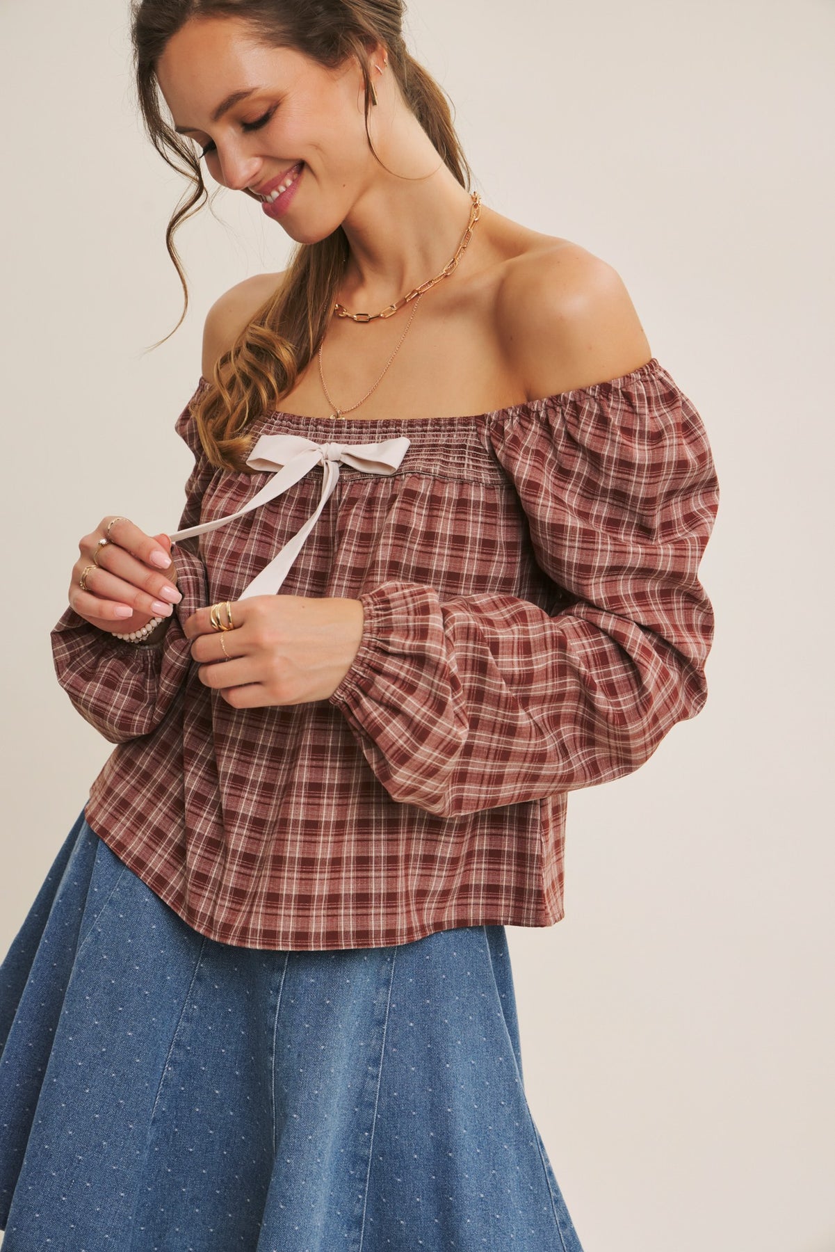 COTTAGEORE CHARM PLAID SMOCKED BLOUSE WITH DELICATE