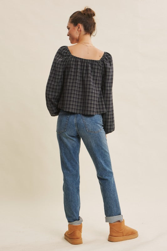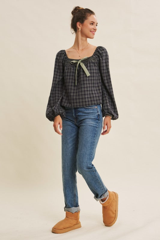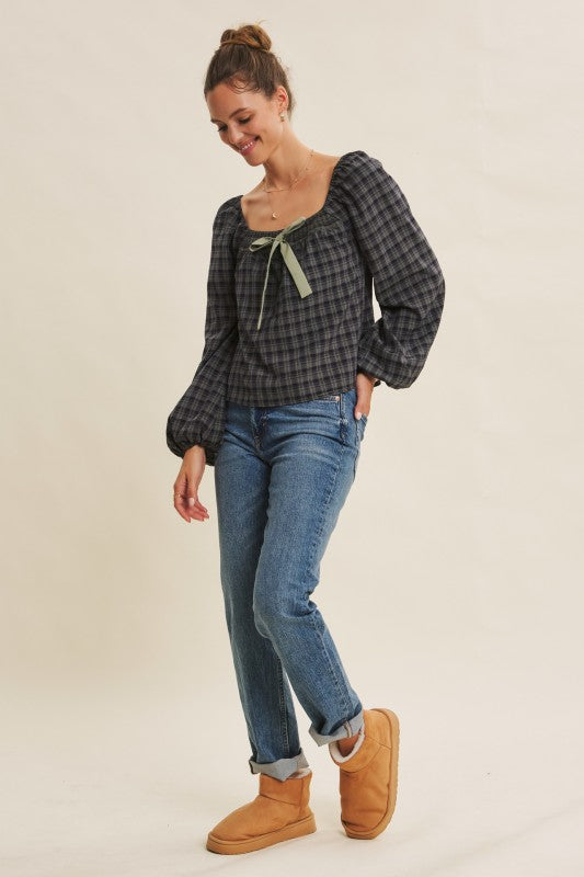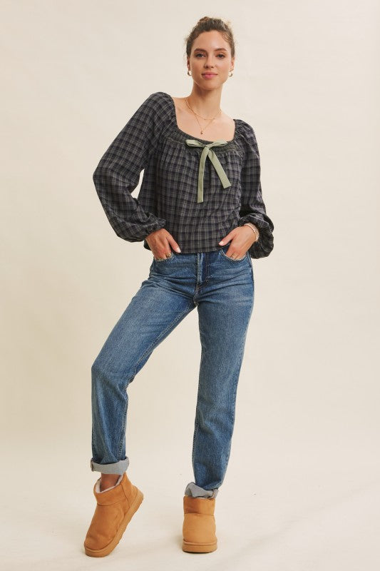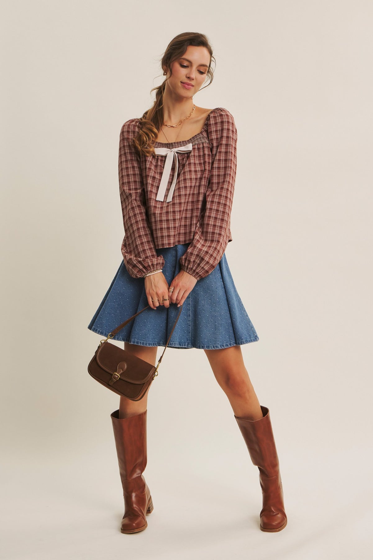 COTTAGEORE CHARM PLAID SMOCKED BLOUSE WITH DELICATE