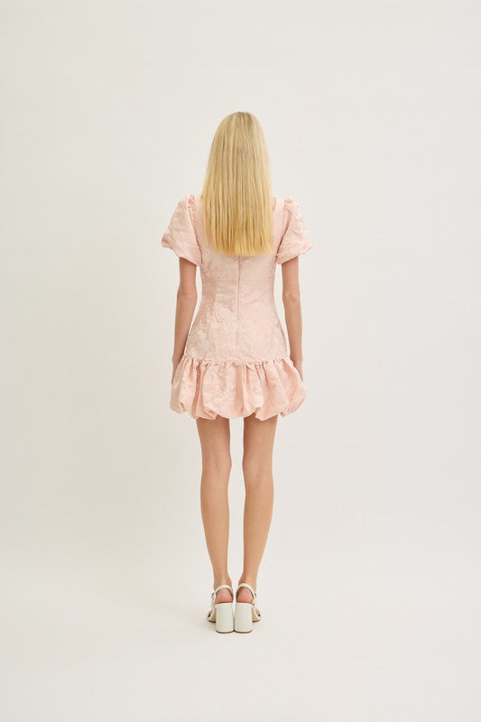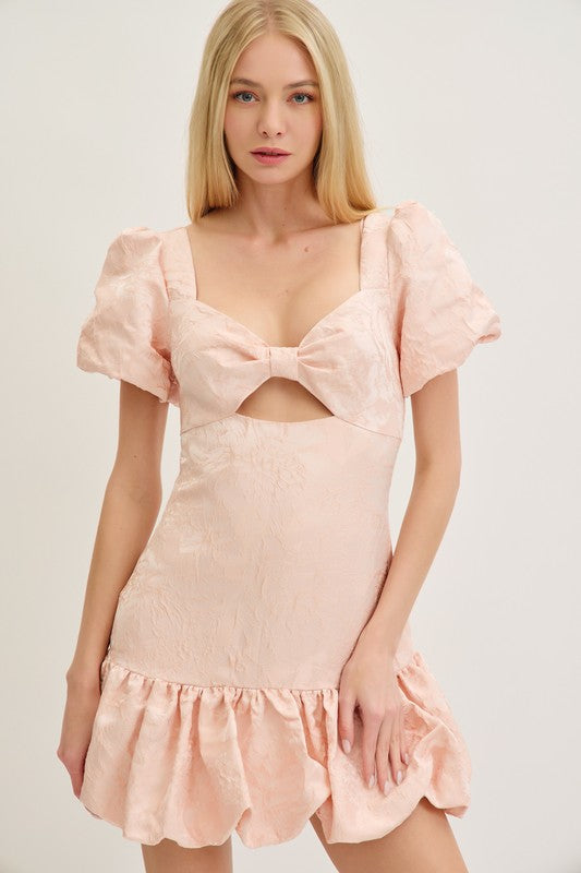 Just Peachy Jacquard Cutout Bubble Hem Mini Dress