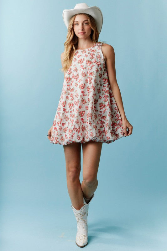 FLORAL PRINTED COTTON POPLIN SLVLESS BUBBLE HEM MINI DRESS