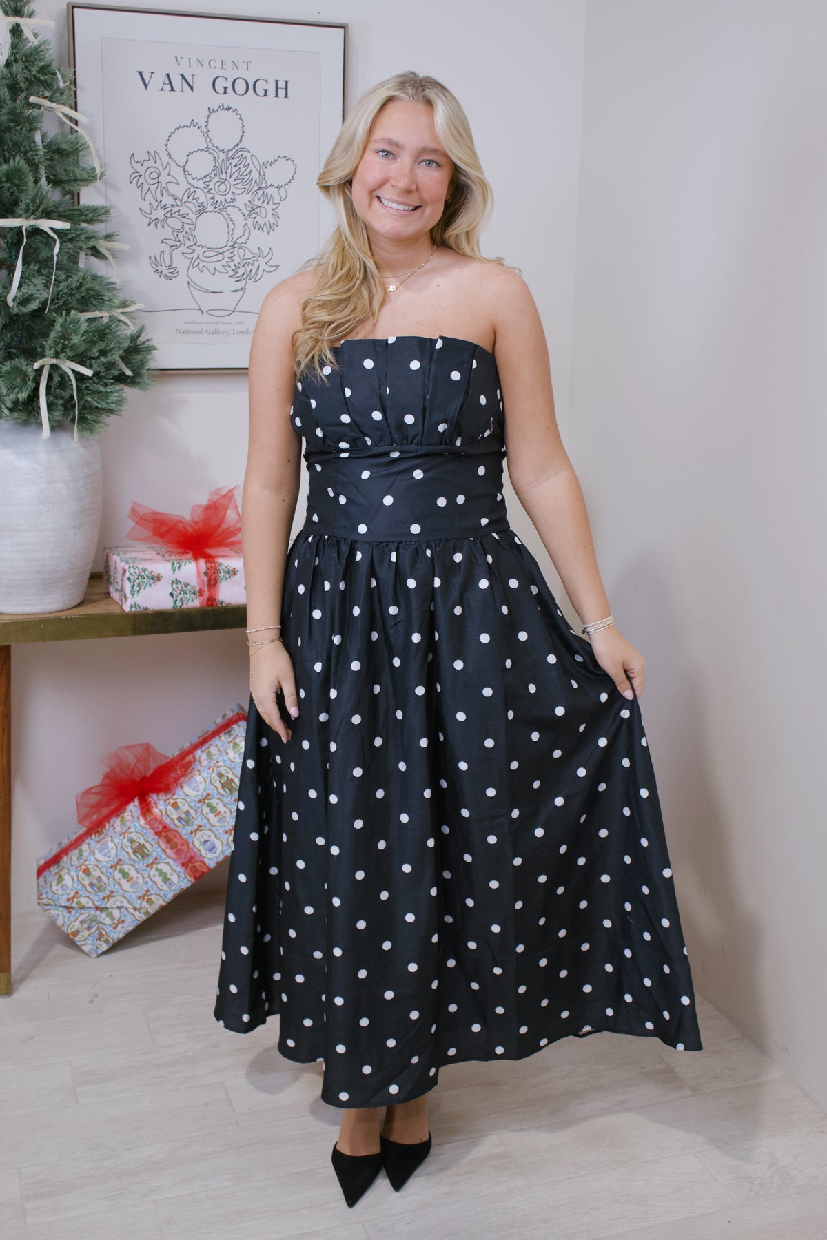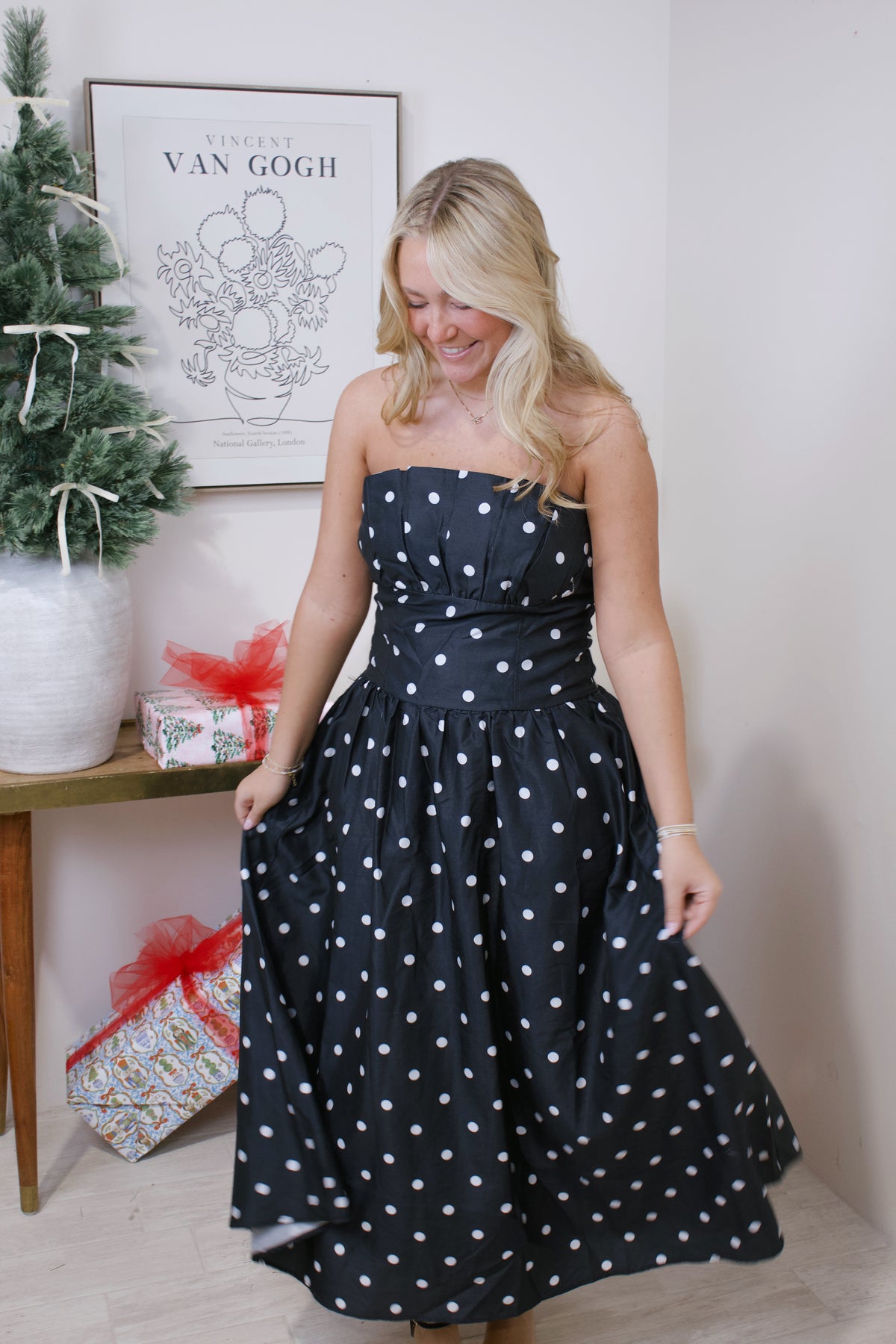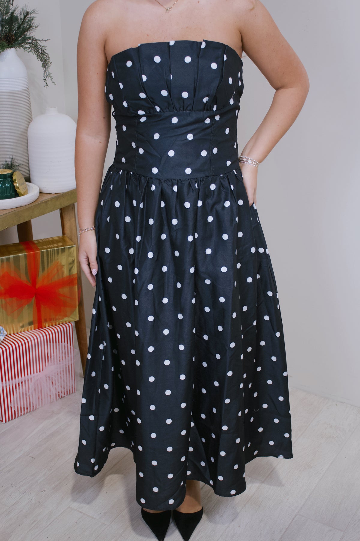 • Polka Dot Strapless Dress