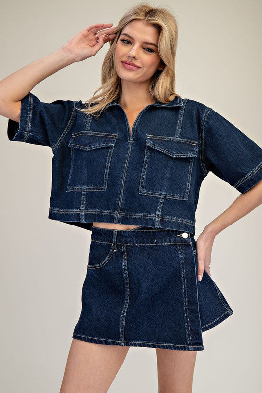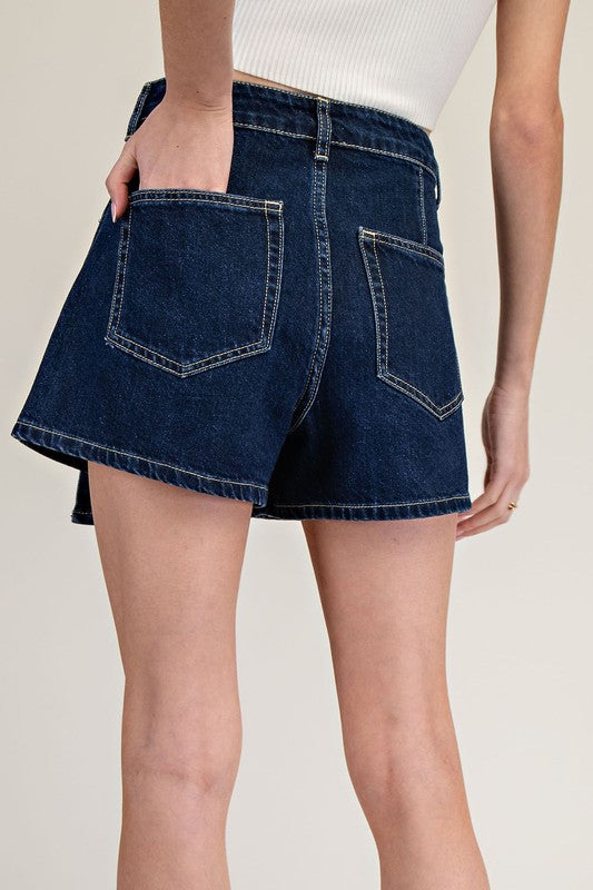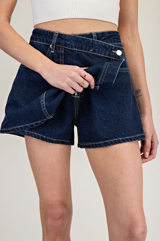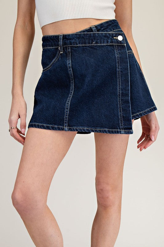 High waisted asymmetrical denim skort. See 'Stylish Intentions Denim V-Neck Cropped Short Sleeve Top' for complete look.