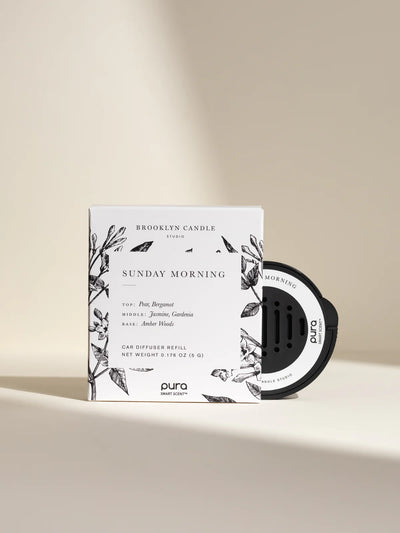 Turn your car into a serene escape with Sunday Morning’s bright pear and bergamot, soft florals, and calming amber woods.